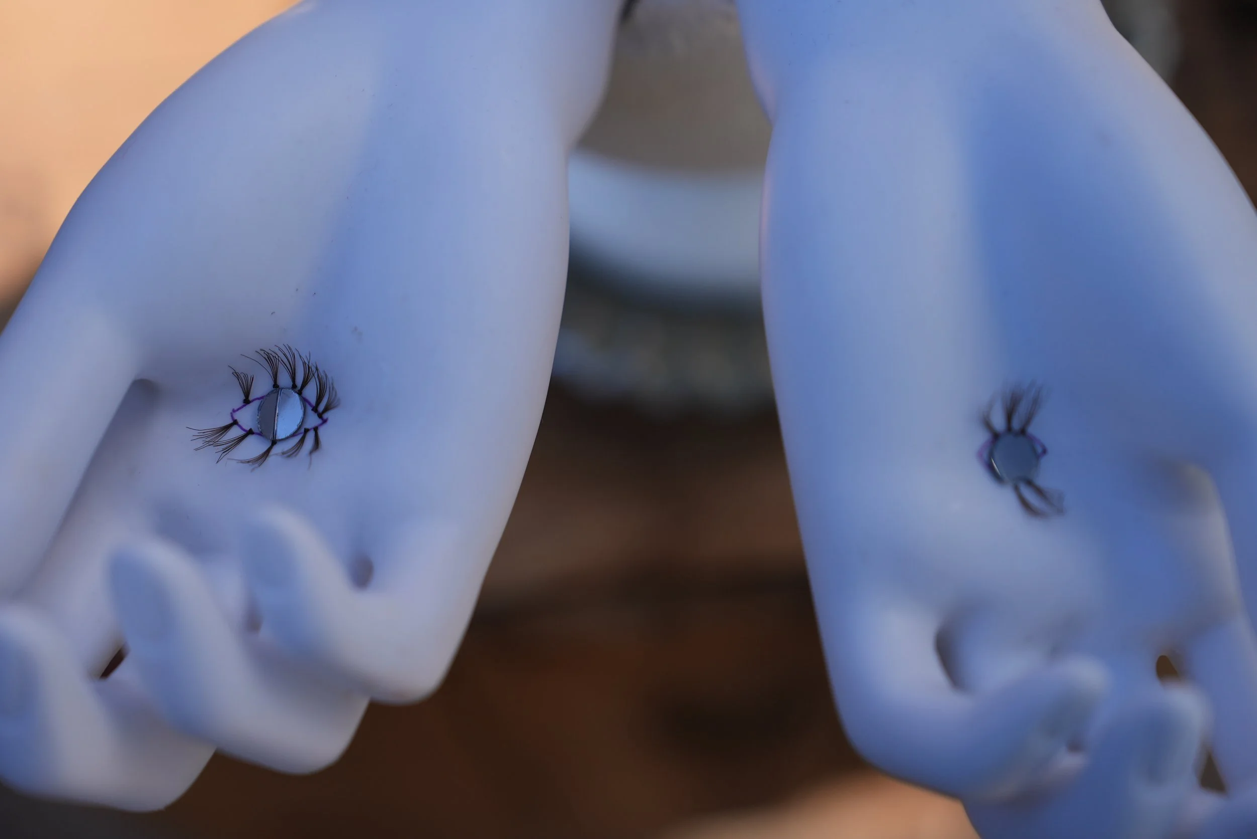 At the same time, IVF is always an act of love. Inside the palms of the hands, I made eyes with mirrors from a blanket that Sarah gave me and fake eyelashes that I inherited from my grandmother, two matriarchs in my life. These eyes see my hope.
