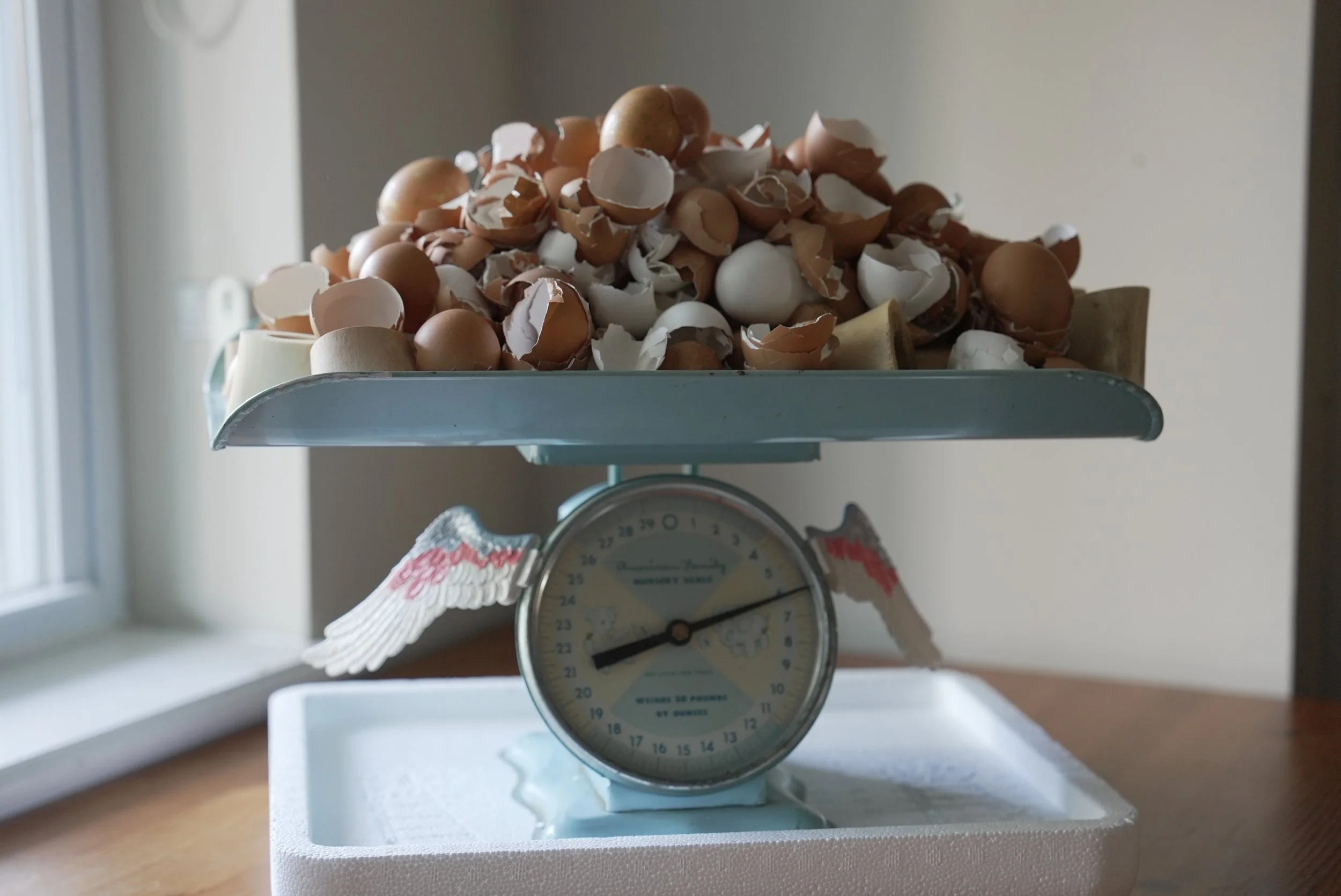 These works were made in real time as the procedures unfolded and are made from the waste generated by my care. The syringes are the ones that injected medicine into my body. The egg shells and bones are from the protein that I ate. Even the paper, I took from the examination tables I laid on.