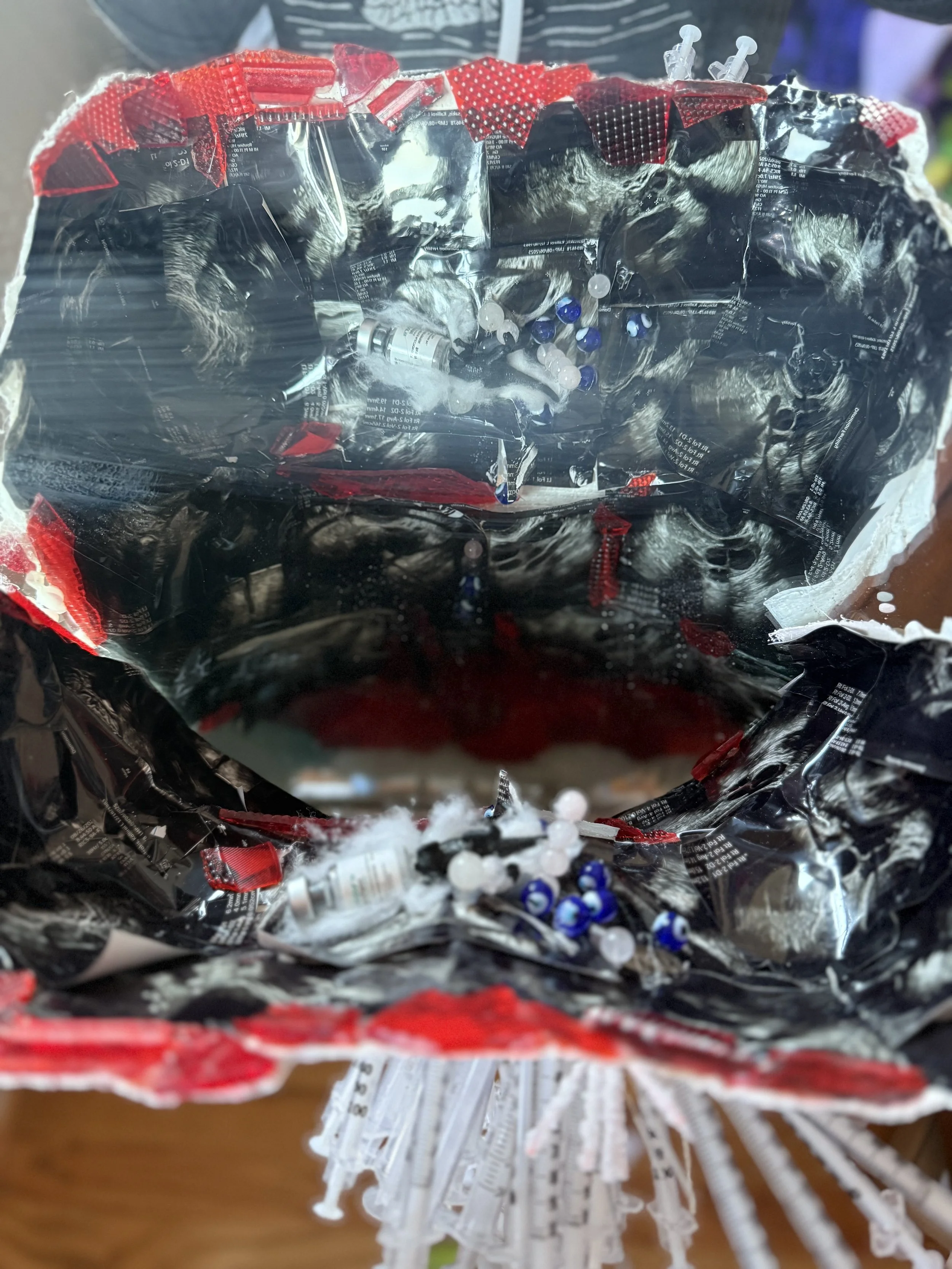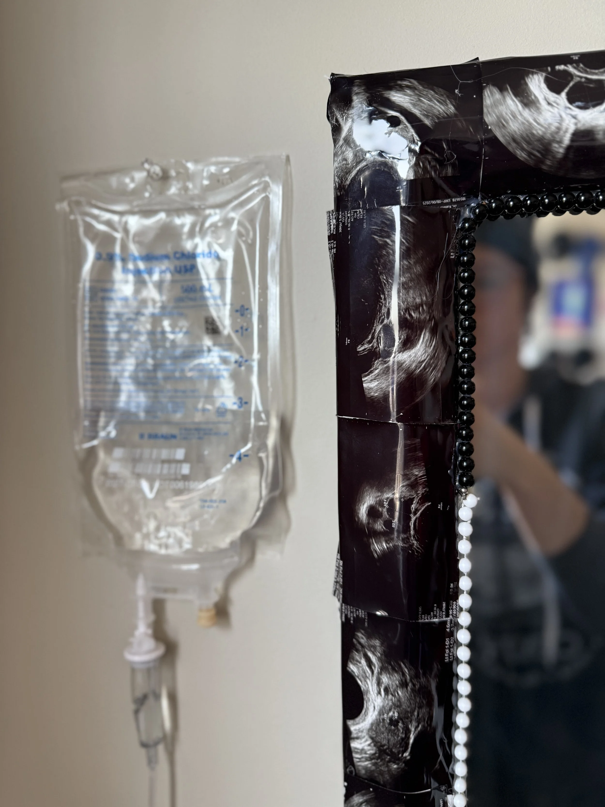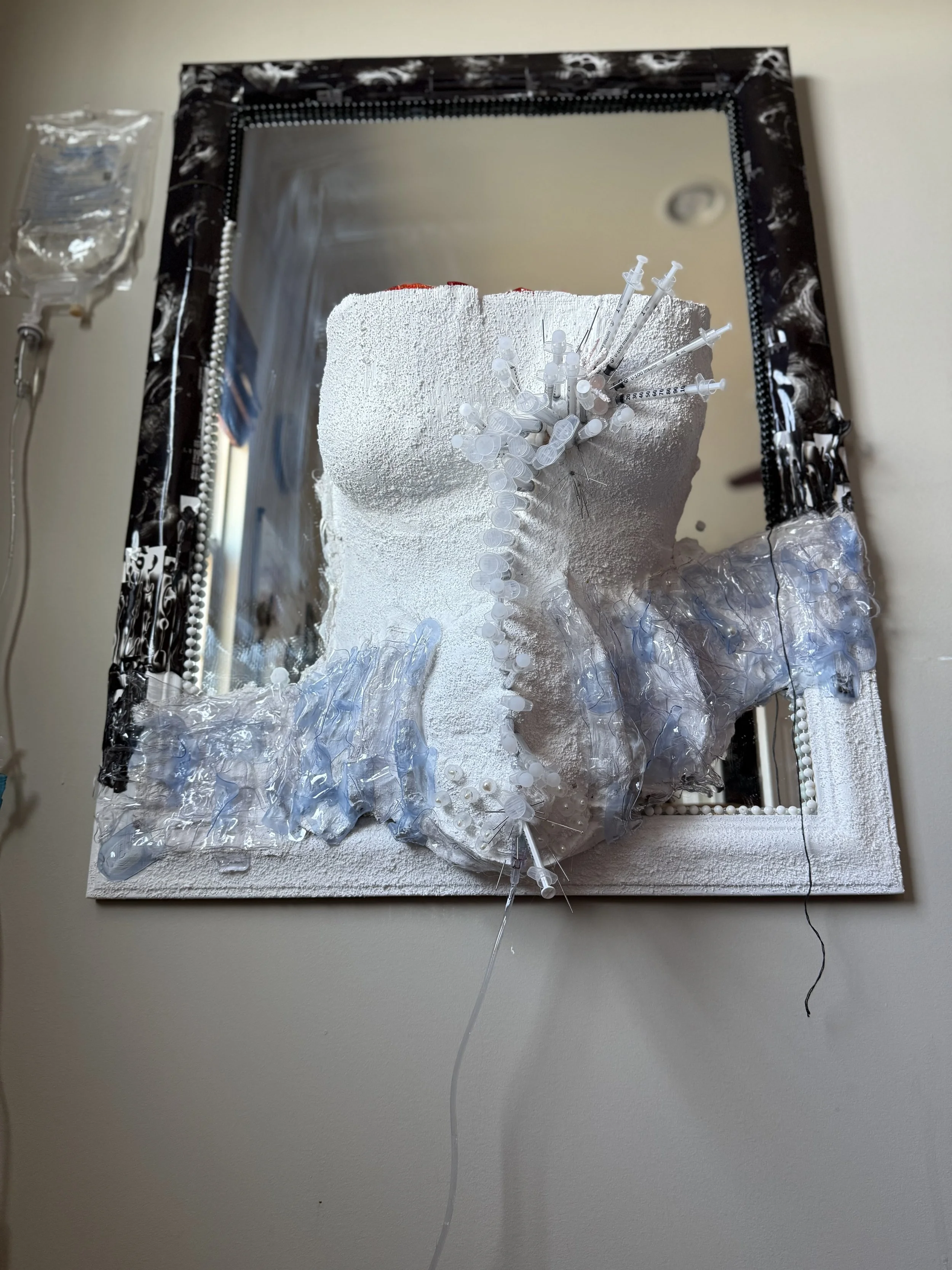 Materials sourcing: plaster cast of my body and face, IV tube from my fourth attempt at egg retrieval, epson salts not used in my stress reduction baths, sonogram photos measuring my follicles during monitoring appointments, mirror from my old housemate Ash’s room that they gave me when they moved out to live with their pregnant partner (Zo went through two successful rounds of egg retrieval and got pregnant during this same time period), beads from Valley Thrift in White Oak, rose quartz beads bought at an estate sale on East Capitol Street 2022, mati beads brought back from greece in 2023, vile of menopur that I accidentally didn’t inject, dinosaur toy from family dollar, cotton balls and swabs from monitoring appointments, q-cap wrappers, acupuncture needles, folliston needles, menopure needles, ribbon from Value Village on Georgia Avenue, NW, broken reflector found on the street in Tenlytown outside of my acupuncturists office.