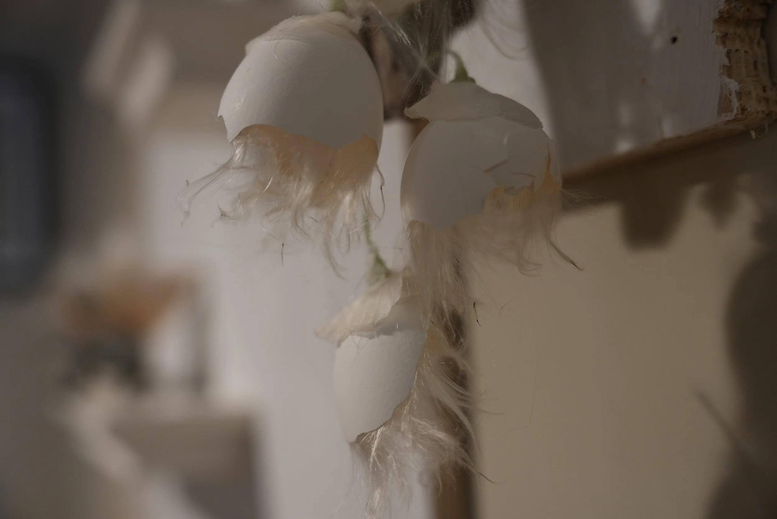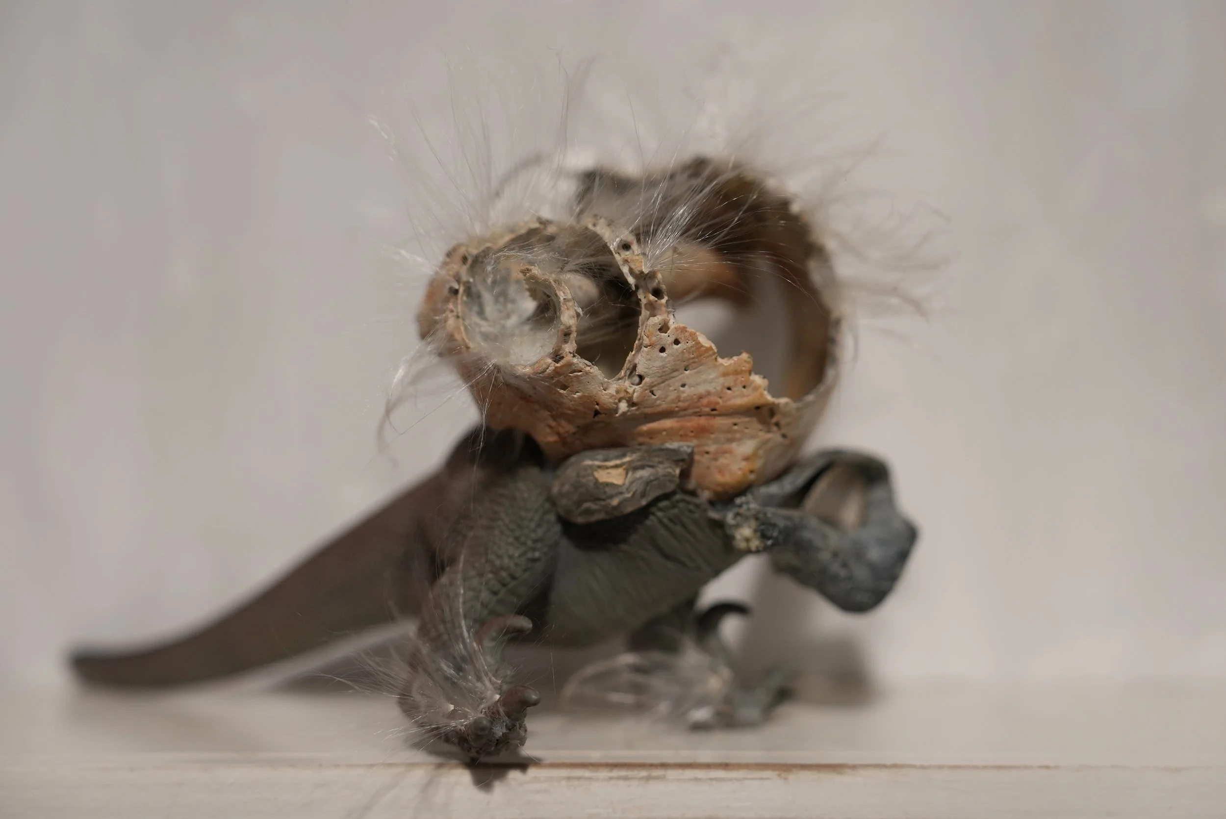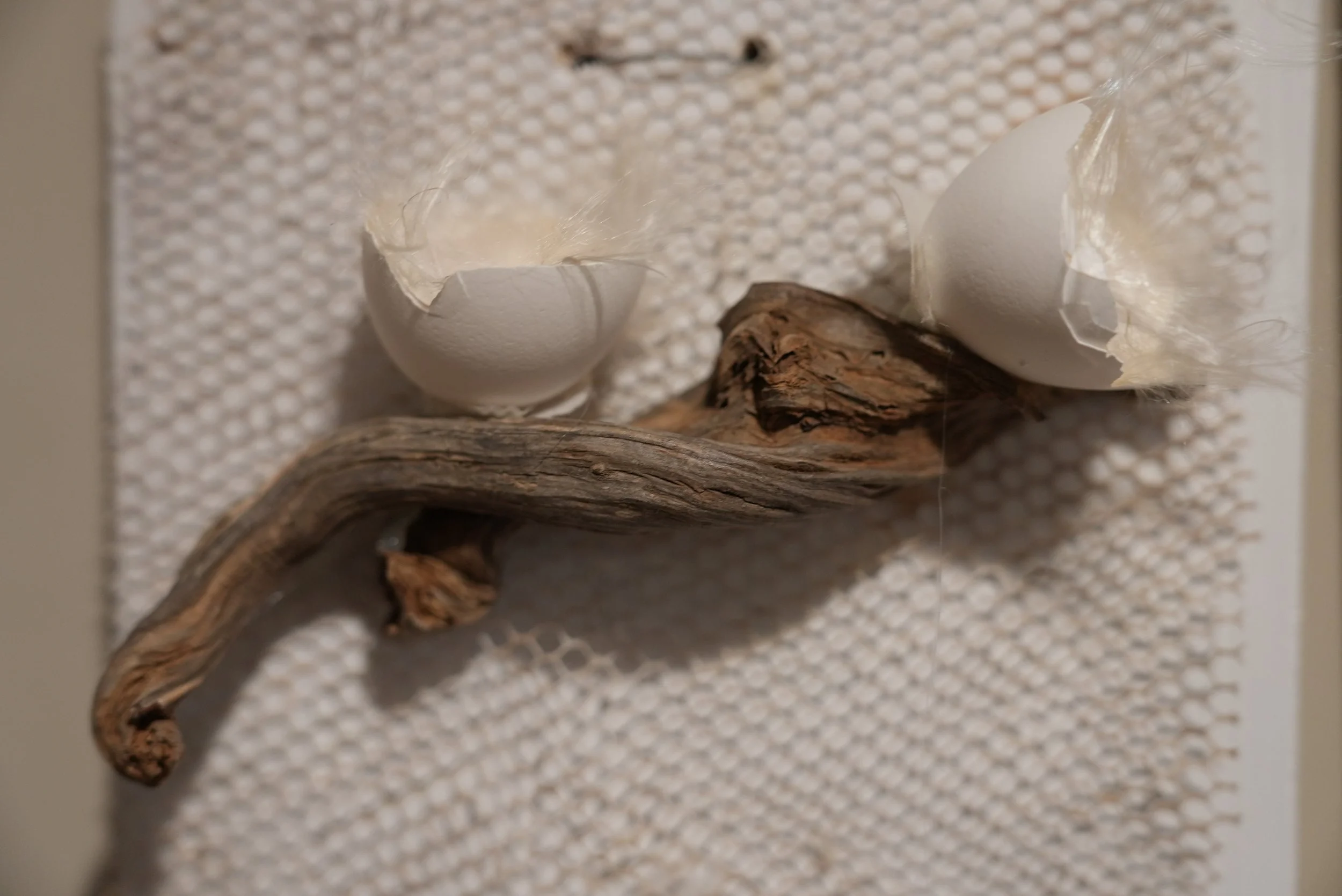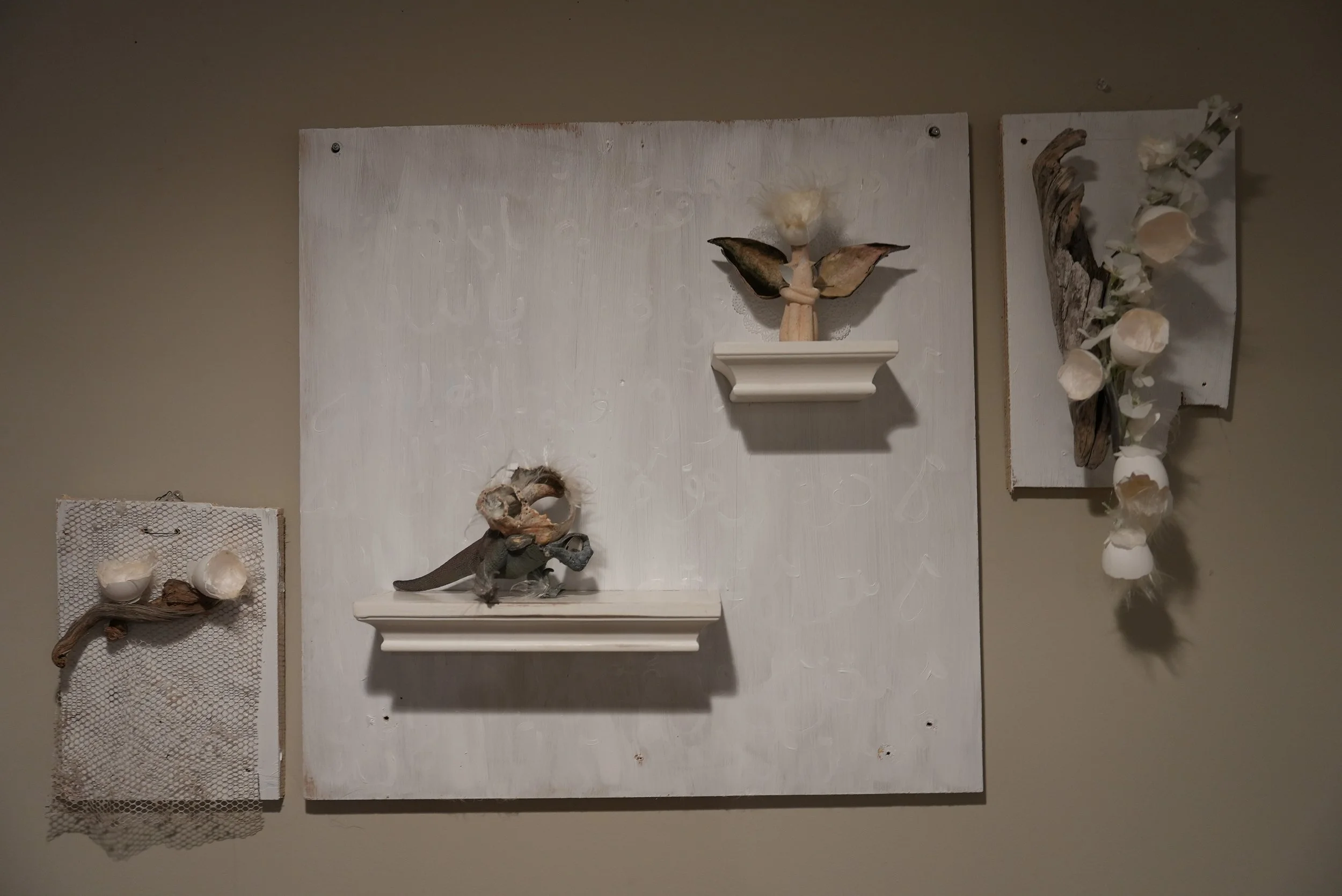Materials: Wood board used in failed attempt at another sculpture; egg shells from eggs eaten in December 2024; milk weed pods and fluff from a visit to Gopi in November 2024, the seeds were planted in my yard and are grew; drift wood found on the Potomac in 2023; Juniper wood found in New Mexico October 2021; mesh from the back of a tile square gotten from buy nothing Petworth in 2022; dinosaur toy found in my house, origin unknown; sea shells from Ocracoke beach trip in 2015 with Michelle’s family (when I first learned to play in the ocean); reproduction of a Cycladic ‘Idol Girl’ sculpture bought in Athens 2022 to replace the one I bought in 1994 on a family vacation, at that time I thought it was the most beautiful thing I had ever seen; twisted metal rod found on the street in Petworth 2019.