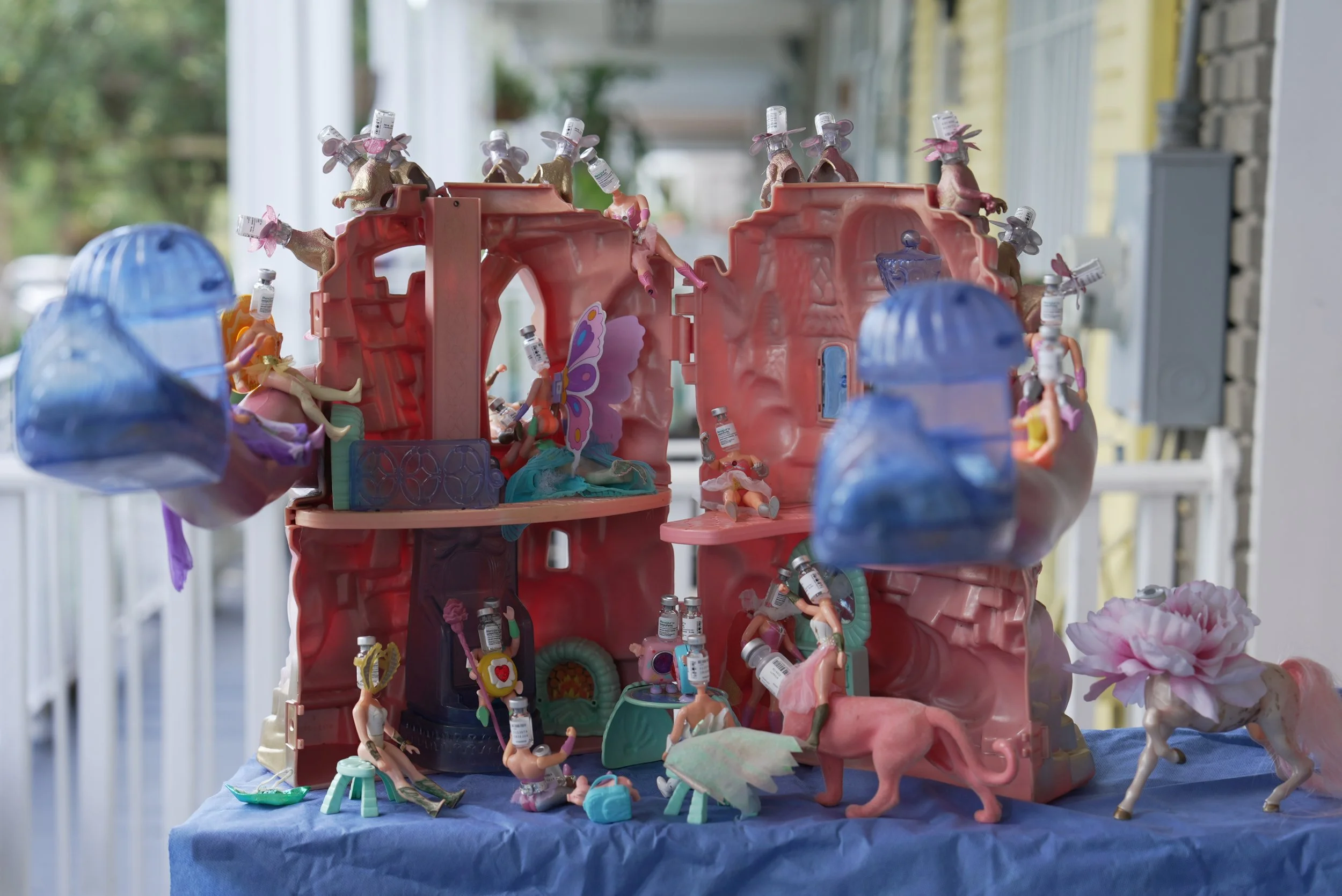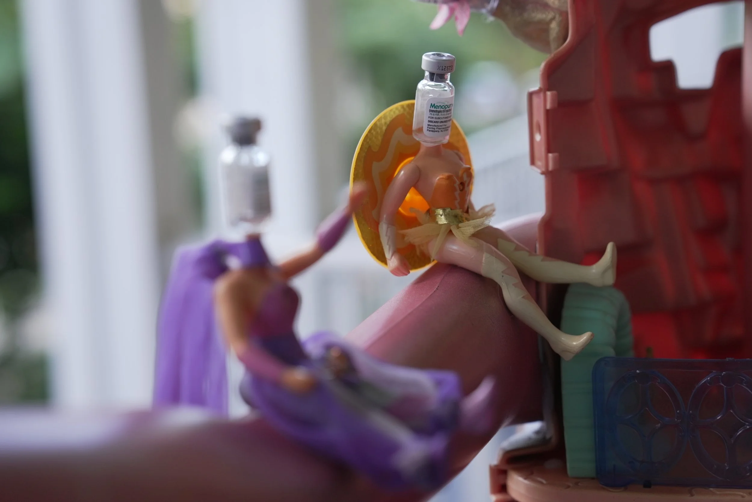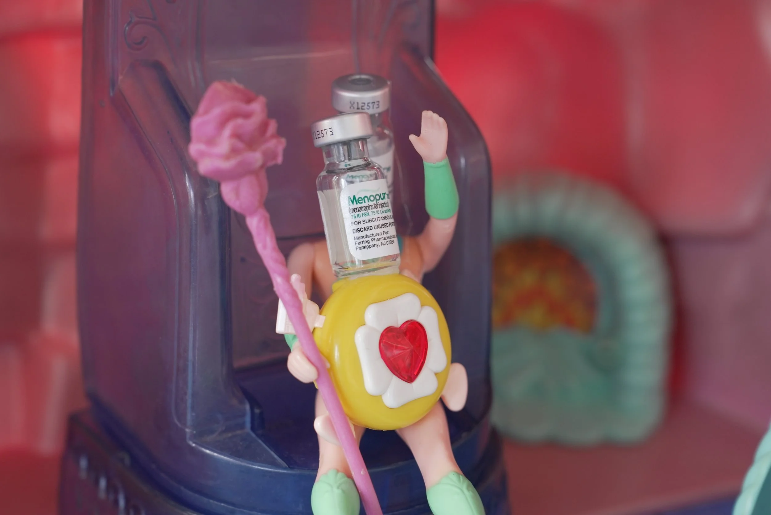 Materials: Menopur viles from my third and fourth round of IVF; Follistin pen needle packaging; Menopur q-caps; She-Ra palace, furniture, horses, lion and dolls from Diana’s childhood toys; Polly Pocket from Diana’s childhood toys; additional She-Ra dolls from buy nothing Petworth; therapod dinosaurs found in a free box on Emerson St NW; silk peony left over from Caroline’s birthday chair; blue medical gown and slippers that I wore during my fourth, ultimately unsuccessful, egg retrieval procedure; arms from a mannequin used in a 2024 banned book display at MLK Library and then abandoned.