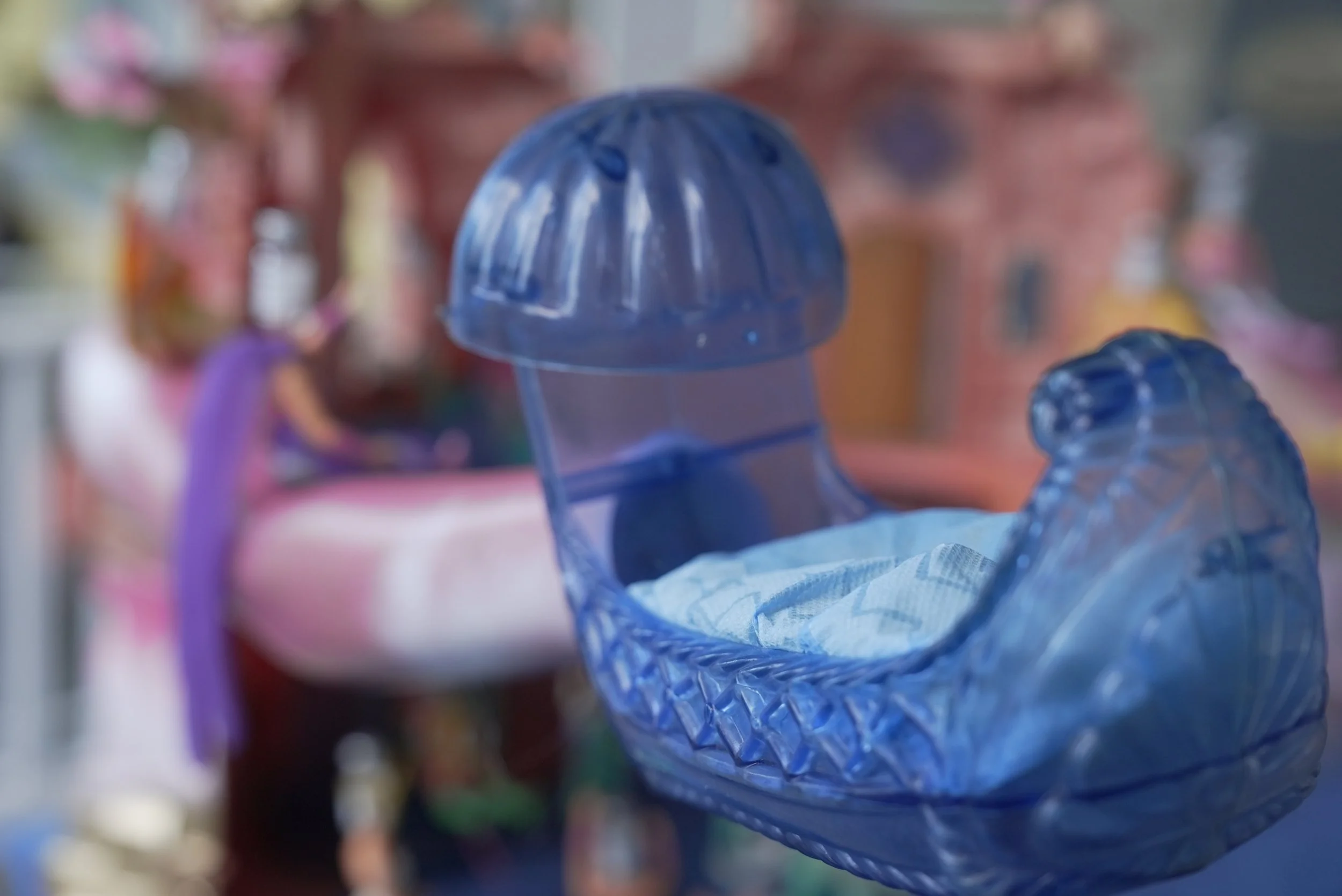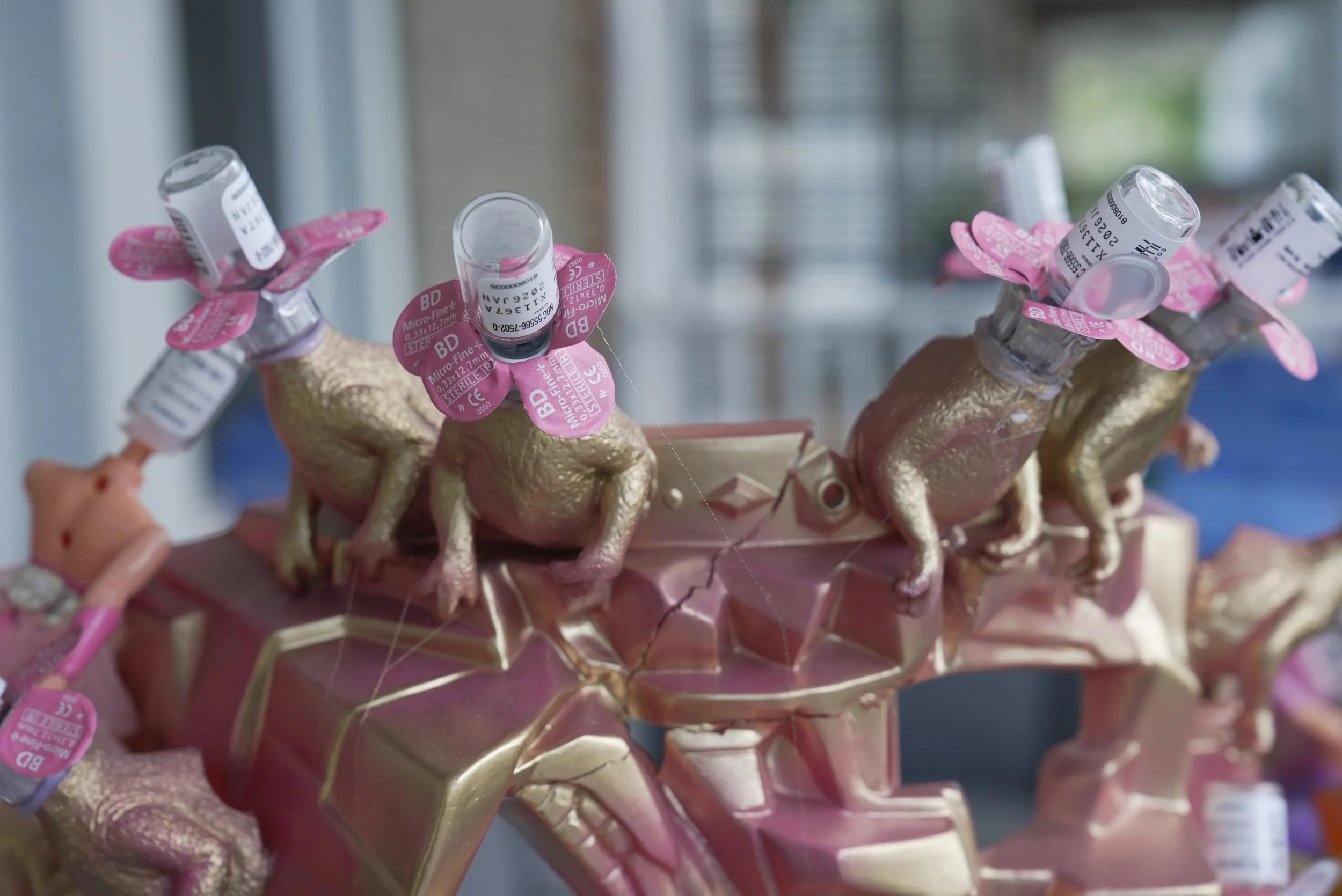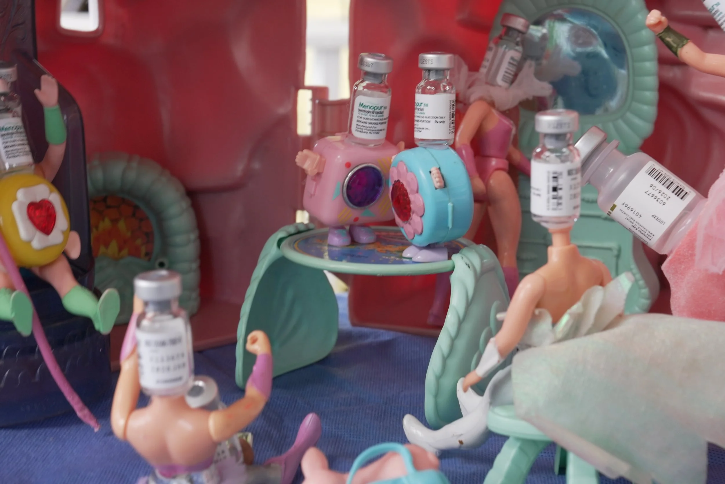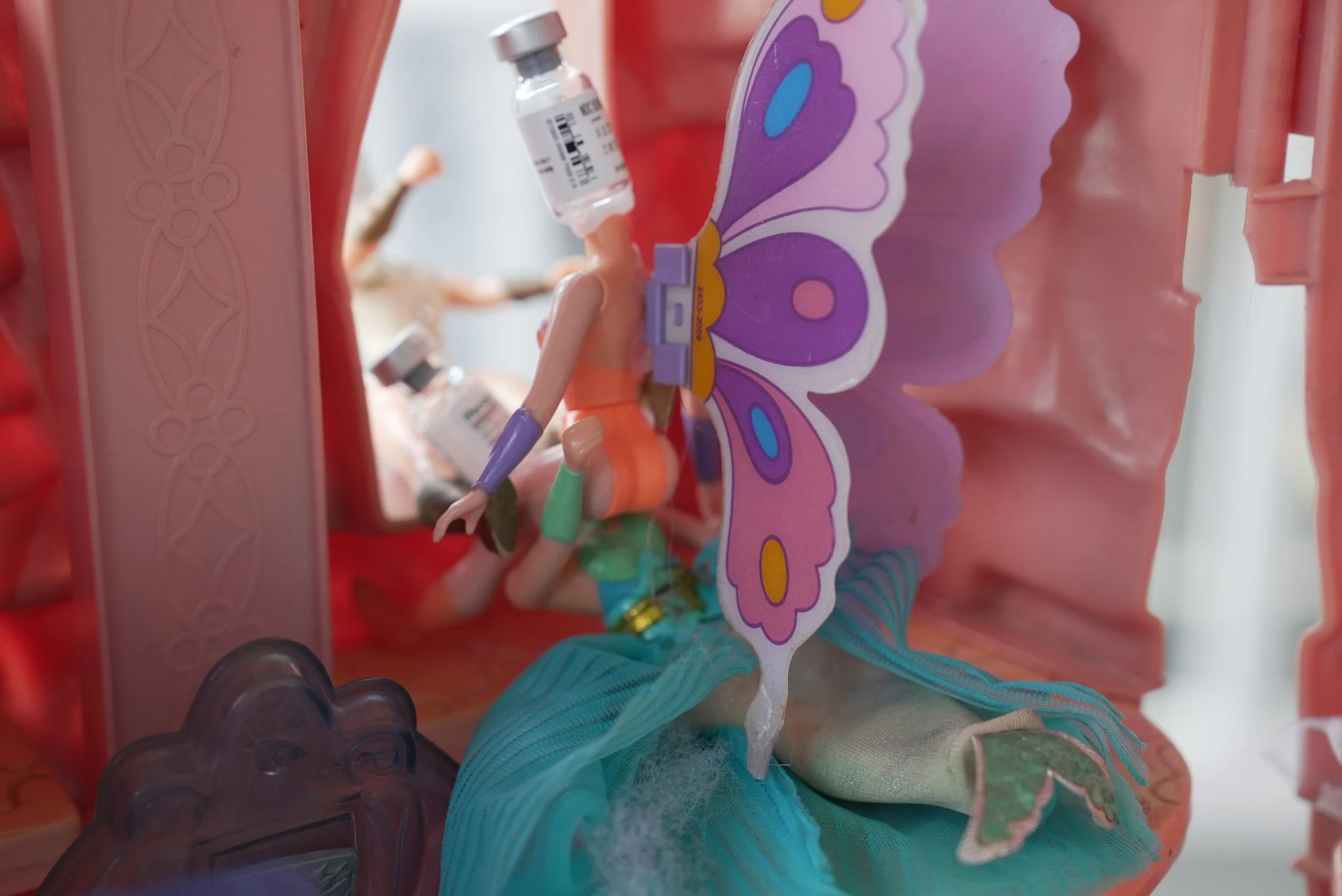Materials: Menopur viles from my third and fourth round of IVF; Follistin pen needle packaging; Menopur q-caps; She-Ra palace, furniture, horses, lion and dolls from Diana’s childhood toys; Polly Pocket from Diana’s childhood toys; additional She-Ra dolls from buy nothing Petworth; therapod dinosaurs found in a free box on Emerson St NW; silk peony left over from Caroline’s birthday chair; blue medical gown and slippers that I wore during my fourth, ultimately unsuccessful, egg retrieval procedure; arms from a mannequin used in a 2024 banned book display at MLK Library and then abandoned.