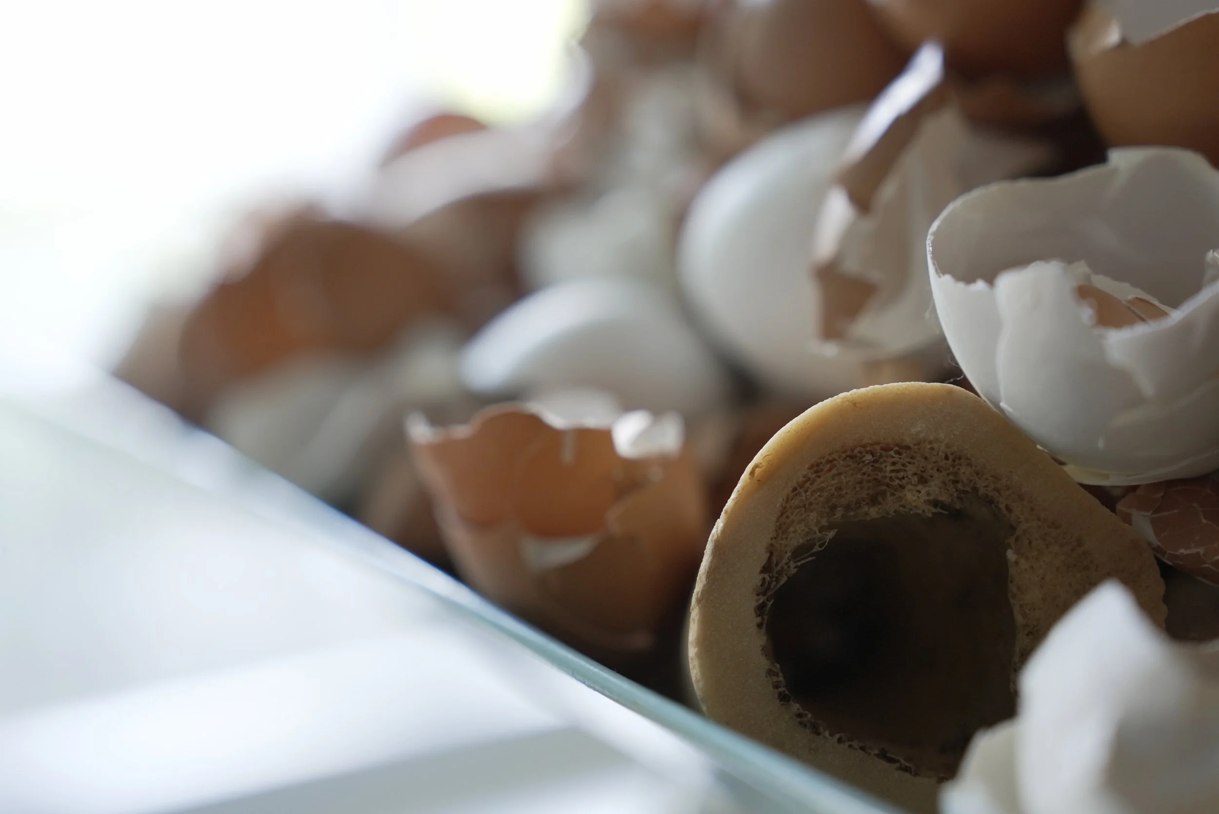 Materials: functioning baby scale found on a walk to to Winter’s house in February 2025; egg shells from eggs I ate starting in December 2024, bones I used to make bone broth starting December 2024; wings from She-Ra’s horse “Spirit” from Diana’s childhood toy collection; styrofoam lid from IVF medication delivery in December 2024.